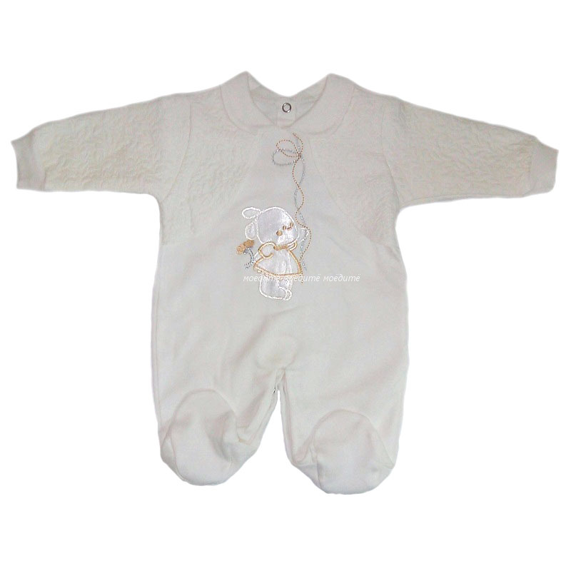 Комбинезон с длинным рукавом на манжетиках, с закрытыми ножками, с отложным воротничком, сзади по все длине и между ножек на кнопочках. Комбинезон украшен спереди аппликацией. Рукава и вшитая спереди накидка-болеро выполнены из материала жатка.