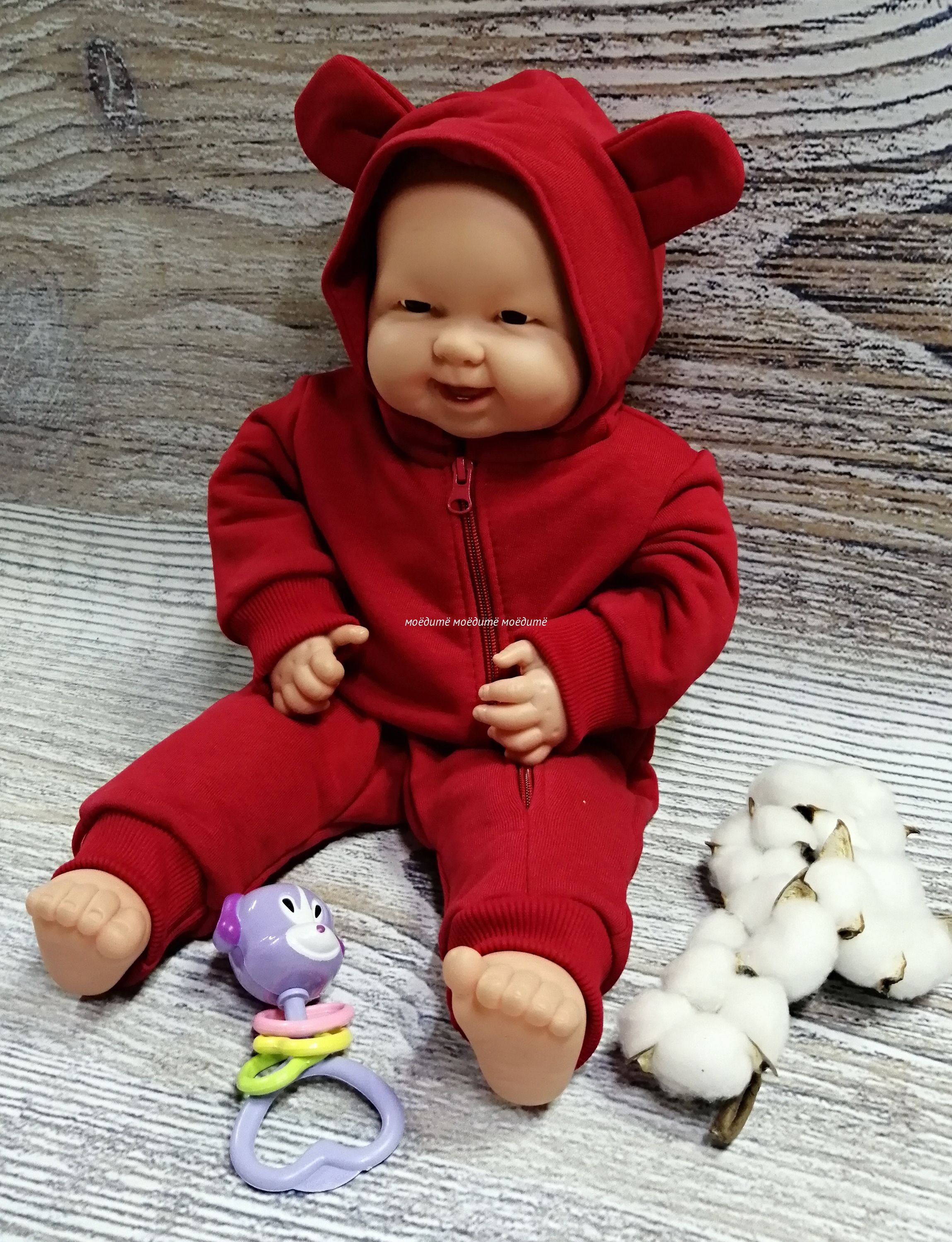 Комбинезон с открытыми ножками, с капюшоном, рукава на манжете, спереди на молнии до конца одной ножки. Капюшон декорирован ушками.